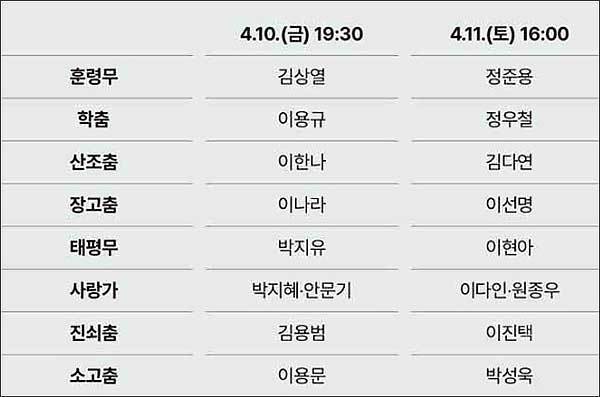 출연자는 훈령무 김상열ㆍ정준용, 학춤 이용규ㆍ정우철, 산조춤 이한나ㆍ김다연, 장고춤 이나라ㆍ이선명, 태평무 박지유ㆍ이현아, 사랑가 박지혜ㆍ안문기와 이다인ㆍ원종우, 진쇠춤 김용범ㆍ이진택, 소고춤 이용문ㆍ박성욱 등이 무대로 오른다.