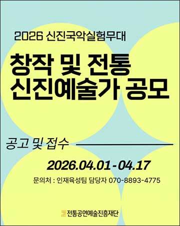 [우리문화신문=정석현 기자] 전통공연예술진흥재단(이사장 배영호)이 ‘2026 신진국악실험무대’에 오를 창작과 전통 신진예술가를 4월 1일부터 17일까지 모집한다. 전통예술을 바탕으로 활동하는 신진예술가들의 등용문 역할을 하는 ‘신진국악실험무대’는 예술가들의 경쟁력을 강화하고 활동 기반을 마련하기 위한 공연 기회를 제공한다.