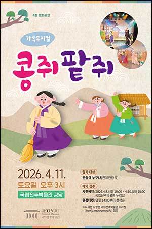 [우리문화신문=이한영 기자] 국립전주박물관(관장 박경도)은 오는 4월 11일(토) 낮 3시, 박물관 내 강당에서 가족 뮤지컬 <콩쥐팥쥐>를 한다. 이번 공연은 ‘문화가 있는 날’ 주간과 연계하여 평일 관람이 어려운 가족 단위 방문객들에게 주말 문화 누림 기회를 제공하고자 마련되었다. 특히 전북지역을 배경으로 만들어진 콩쥐팥쥐 설화 내용을 뮤지컬로 만나 볼 수 있는 것이 특징이다.