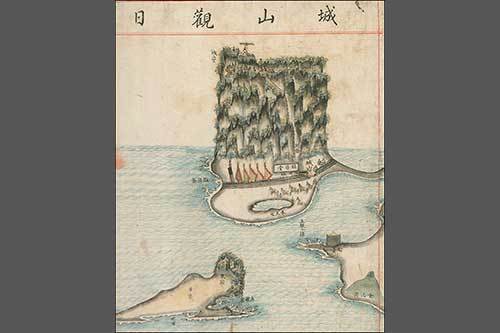 험준한 절벽에 나무 사닥다리로 어렵게 올라간 정상에서 그는 마치 연꽃이 바다에서 나와 공중에 걸려 있는 모습으로 해돋이의 순간을 기억했습니다. 그의 기억은 이 그림에서도 잘 반영되어 있는데 성산 입구에서 정상인 성산망까지 오르는 가파른 등정길이 자세하게 나타나 있으며 암반을 깎아 만든 계단인 각교도 표시되어 있습니다. 화공 김남길은 간결한 선과 색채로 이형상의 기억 속 성산과 해돋이의 순간을 인상적으로 그려냈습니다.