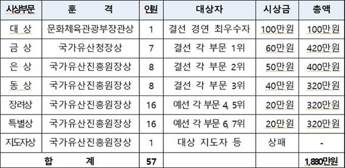 대회 일정은 오는 7월 5일 예선을 시작으로, 7월 11일 결선이 치러진다. 경연은 서울 소재 국가무형유산전수교육관과 한국문화의집(KOUS)에서 열린다. 총상금은 1,880만 원이며, 예선에서 선발된 부문별 1~3위가 결선에서 최종 경합을 벌이게 된다. 전 부문 통합 1위인 대상 수상자에게는 문화체육관광부장관상과 상금 100만 원을 준다.