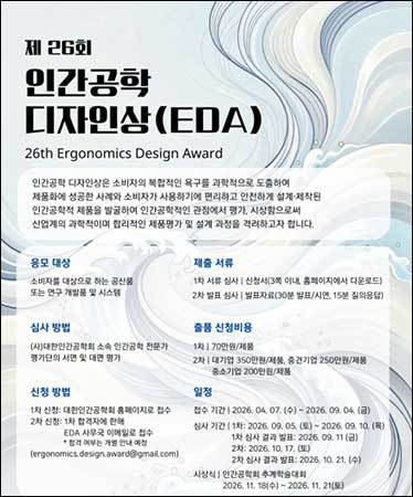 [우리문화신문=이한영 기자] 대한인간공학회는 소비자가 사용하기 편리하고 안전하게 설계된 우수 제품을 발굴하기 위해 ‘제26회 인간공학 디자인상(EDA, Ergonomics Design Award)’ 출품작을 모집한다고 밝혔다. 인간공학 디자인상은 소비자의 복합적인 욕구를 과학적으로 도출해 제품화에 성공한 사례를 발굴하고, 이를 인간공학적 관점에서 평가하고 시상함으로써 산업계의 합리적이고 과학적인 제품 평가와 설계 과정을 격려하기 위해 마련됐다.