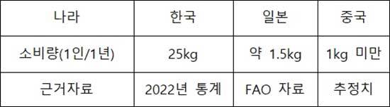 우리나라에서는 해조류를 단순히 간식이나 고명으로 먹는 것이 아니고 쌈이나 나물 형태로 먹거나 국으로 끓여서 대량 소비한다. 한국 일본 중국은 해조류를 먹는 동양 3국이지만, 국민 1인당 해조류 소비량은 우리나라가 압도적으로 1위다.