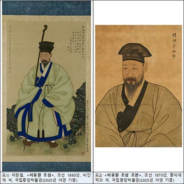 기증품 가운데 가장 시선을 끄는 작품은 1860년 작 <이유원 초상>이다.(도1) 조선 말 대표적 화원(畫員) 이한철(李漢喆, 1812~1893 이후)이 그린 이 초상은 그동안 기록으로만 전하던 작품으로, 집안에서 소중히 보관해 오다 이번에 처음으로 대중에게 공개한다. 인물의 생생하고 사실적인 묘사는 초상화로 이름 높았던 이한철의 표현력을 잘 보여주며, 평상복에 나막신을 신고 지팡이를 든 채 괴석에 앉은 이유원의 모습은 일반적인 사대부 초상과 다른 이채로운 특징을 지닌다.