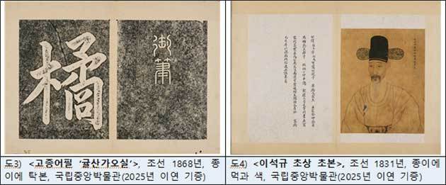 이와 함께 이유원의 57살 초상(도2)을 비롯해 그의 조부 이석규(李錫奎, 1758~1839)와 4대조 이종백(李宗白, 1699~1759) 초상 등 3점의 초상화 밑그림을 확인할 수 있다.(도3) 특히 고종(高宗)이 하사한 어필(御筆)(도4)과 비답(批答, 상소문에 대한 임금의 대답)은 그가 고종의 두터운 신임을 받았음을 잘 보여준다.