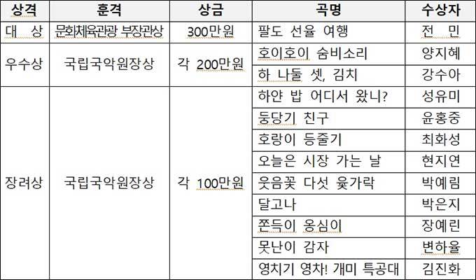 이번 공모전에는 모두 115개 작품이 출품되었고, 전통적인 국악의 요소를 잘 담아낸 12곡이 수상작으로 뽑혔다. 영예의 대상은 전민 작사ㆍ작곡의 ‘팔도 선율 여행(Melodic Journey Across Korea)’이 선정됐다. 이 작품은 남도의 육자배기 토리, 서도의 수심가 토리, 동부의 메나리 토리, 서울·경기의 경토리 등 전국 각 지역의 다양한 토리를 가사와 선율에 담아냈으며, 굿거리와 자진모리 장단을 함께 활용해 지역별 음악적 색채와 다양한 분위기를 효과적으로 표현해 교육성과 예술성을 고루 갖춘 완성도 높은 작품으로 평가받았다.