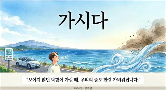그림 속, 푸른 제주 바다를 곁에 두고 시원하게 뻗은 길 위로 하얀 전기차가 매끄럽게 달리고 있습니다. 차창을 내리고 눈을 감은 채 맑은 공기를 들이마시는 청년의 표정에서 말로 다 못 할 평온함이 느껴지네요. 화면 오른쪽, 거센 파도에 씻겨 내려가는 누런 흙먼지는 우리가 지난날 겪었던 '흙비'의 기억일지도 모릅니다. 10년이라는 긴 시간 동안 정성껏 가꾸어 온 친환경 정책이 저 탁한 기운을 밀어내고 눈부시게 푸른 숨결을 되찾아준 풍경, 그 상쾌한 변화에 딱 맞는 우리말을 소개합니다.