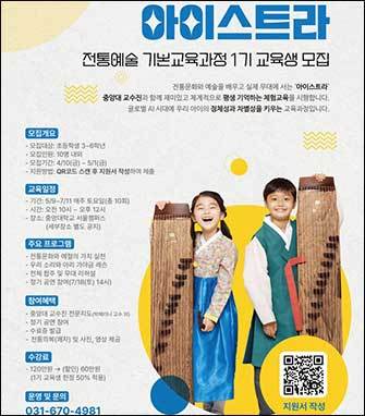 [우리문화신문=김영조 기자] 중앙대학교 학교기업 아리(Ari)가 유소년 전통예술악단 ‘아이스트라’의 전통예술 기본교육과정 1기 교육생을 오는 5월 1일까지 모집한다. 아이스트라는 우리 아이들이 전통문화와 예술을 재미있고 체계적으로 배우고 실제 무대에 서는 경험까지 제공하는 미래형 통합경험 교육 프로그램이다.