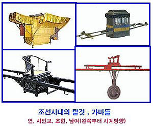 조선시대에 탈것의 하나인 ‘가마’는 임금이 타던 것으로 좌우와 앞에 주렴(珠簾:구슬을 꿰어 만든 발)이 있는 ‘연’, 공주가 타던 연과 비슷한 ‘덩’, 임금이 타는 또 다른 가마로 2 마리의 말이 끄는 ‘가교’, 4 사람이 메는 것으로 민간에서 혼례 때 신부가 타는 ‘사인교’가