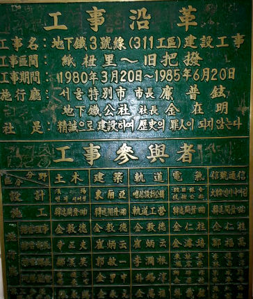 구태여 공사를 한 사람들의 이름을 새겨주고 싶다면 알기쉬운 우리말로 써도 될터인데... 공사연혁(工事沿革, こうじえんかく) 을 비롯해 마치 일본 철도공사 현장 표기를 보는 듯하다. 올해는 세종임금이 한글을 만든지 567돌이다. 제나라 글자를 놔두고 아직도 한자를 공공시설 표기에 앞세우는 것은 왜일까?