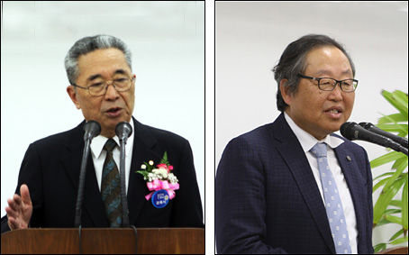 ▲ 인사말씀을 하는 김종택 한글학회장(왼쪽), 축하 말씀을 하는 김주성 한국교원대학교 총장