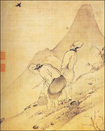 전남 해남군 녹우당(綠雨堂)에 소장돼 있는 <채애도(採艾圖)> 곧 <나물캐기>는 이른 봄날 나물 캐는 아낙네를 그린 작품입니다. 가파르게 대각선으로 그려진 언덕과 산은 어쩌면 이 아낙네들의 팍팍한 삶을 말하고 있는지도 모릅니다. 한 여인은 한 손에 망태기, 한 손에 칼을 든 채 허리를 굽혀 나물을 캐고, 또 한 여인은 고개를 돌려 주위를 두리번 거립니다. 이 그림을 그린 조선시대의 선비화가 공재(恭齋) 윤두서(尹斗緖)는 자신이 양반임에도 헐벗은 백성의 삶을 돌볼줄 아는 사람이었습니다.