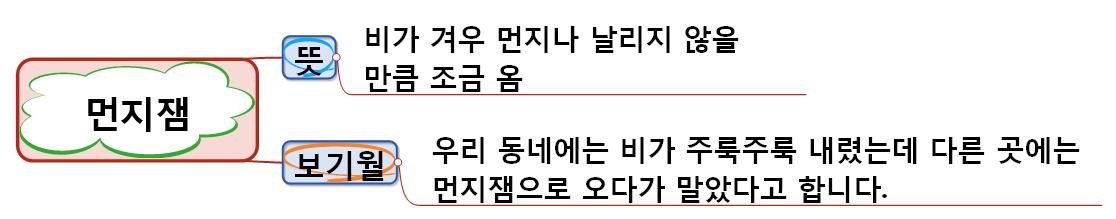 '먼지잼'이라는 비이름을 봐도 우리 한아비들의 말 만드는 솜씨가 남달랐다는 것을 잘 알 수 있습니다. 비이름을 다 다루지는 못했지만 비와 아랑곳한 토박이말을 알려주는 움직그림(http://www.baedalmal.kr/wizbbs/b_view.html?i_code=sub1_2&CATEGORY=&PAGE=1&i_id=17&i_key=&i_value=&i_order=&i_order_exec=&t_code=)을 보시면서 한아비들의 슬기를 느껴 보시는 것도 좋겠습니다.