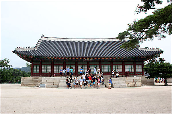 그 “한글가온길” 답사는 김슬옹 교수의 안내로 어제(7월 30일) 오후 4시에 시작되었다. 먼저 국립고궁박물관 앞에서 이 답사의 의의를 간단하게 설명하고 수정전(修政殿)으로 자리를 옮긴다. 세종 당시 집현전이 있었던 수정전 앞에 가자 김슬옹 교수는 퀴즈를 내 흥미를 돋우는 말로 답사의 서막을 내딛는다.