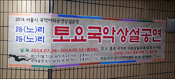지하철 종로3가역에 갔더니 한국국악협회가 내건 펼침막이 있네요. 국악로 야외상설무대에서 토요국악상설공연을 하는가 봅니다. 그런데 펼침막 앞 부분에 "路(노)리"라고 써놓았습니다. 저게 무슨 말인가요? 아마도 길에서 하는 "놀이"라는 뜻으로 길 로(路)를 붙인 모양인데 그런 억지가 어디 있나요? 국악을 "놀이"로 보는 것도 무리가 있지만 우리말 파괴에 앞장 서는 모습은 좋지 않아 보입니다.