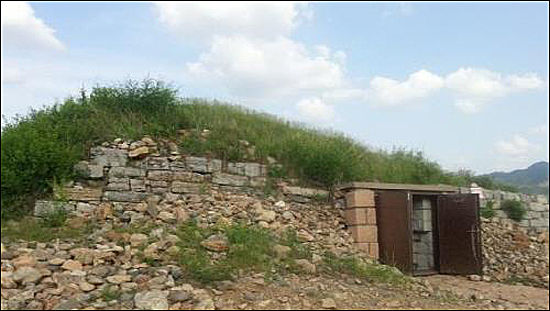 ▲ 아무도 돌보지 않는 광개토대왕릉 위에 설치된 왕릉입구가 폐가처럼 허물어지고 있다. (문학과학통섭포럼 제공)