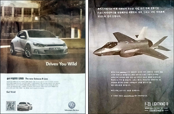 | ▲ 영어가 주인인 폭스비겐코리아의 광고(왼쪽), 상표나 상호를 빼고는 거의 한글로 한 록히드마틴사의 광고 | ||