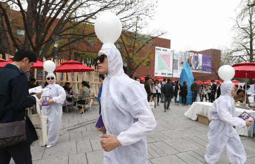 이날 예술인들이 박람회장에서 직장을 찾는 퍼포먼스를 하고 있다