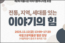 [우리문화신문=김영조 기자] 문화체육관광부(장관 최휘영)가 주최하고 한국국학진흥원(원장 정종섭)이 주관하는 ‘제2회 아름다운 이야기할머니사업 포럼’이 오는 12일 서울 국립고궁박물관 별관 강당에서 연다. 지난해에 이어 두 번째로 열리는 이번 포럼은 ‘전통ㆍ지역ㆍ세대를 잇는 이야기의 힘’이라는 주제로 진행된다. 전통 이야기의 활용과 확산을 논하다 지난해 열린 제1회 포럼에서는 ‘아름다운 이야기할머니 사업의 현재와 미래’를 주제로 사업의 성과와 향후 발전 방향을 논의했다. 올해 제2회 포럼은 지난해의 논의를 확장하여 전통 이야기의 교육적·문화적 활용 방안을 더욱 폭넓게 논의하는 자리가 될 예정이다. 포럼은 1부 교육적 활용, 2부 문화적 확산, 3부 종합토론으로 구성된다. 1부에서는 ▲이정희 교수(경희대)가 「이야기할머니 구연 자료 분석과 한국어교육 활용 방안: ‘도란도란 이야기보따리’ 플랫폼을 중심으로」 ▲조미옥 소장(그림책 공감심리연구소)이 「이야기할머니 ‘활동지도안’ 분석 및 방향 모색 : 그림자료 ‘생각 나누기’영역 중심으로」 ▲이홍식 교수(국립경국대)가 「전통 기록을 바탕으로 한 선현미담의 교육적 재창작과 활용 방안 : 한국국학진흥원의 ‘아름다운 이야기
